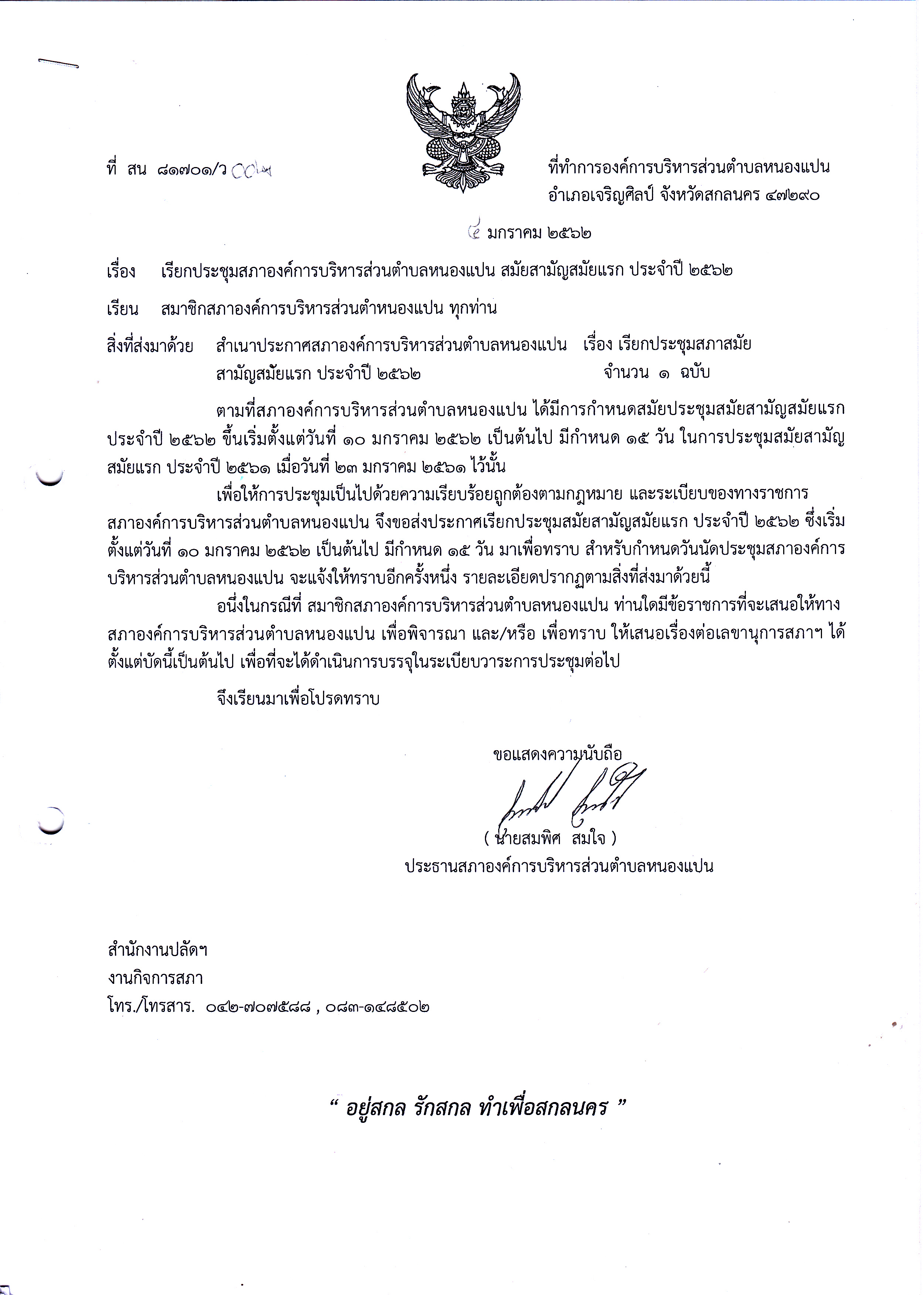 การเรียกประชุมสภาองค์การบริหารส่วนตำบลหนองแปน ประจำปี 2562